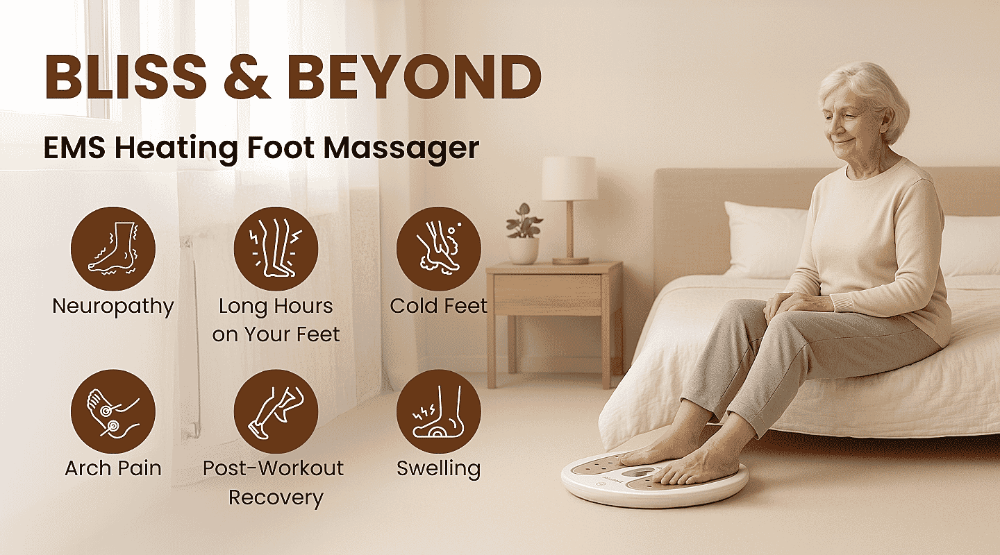 Bliss & Beyond EMS Heating Foot Massager with 20 Intensities and 9 Modes - Reduces Swollen Feet, Relieves Muscle Pain, Remote Control Electrode Pads
