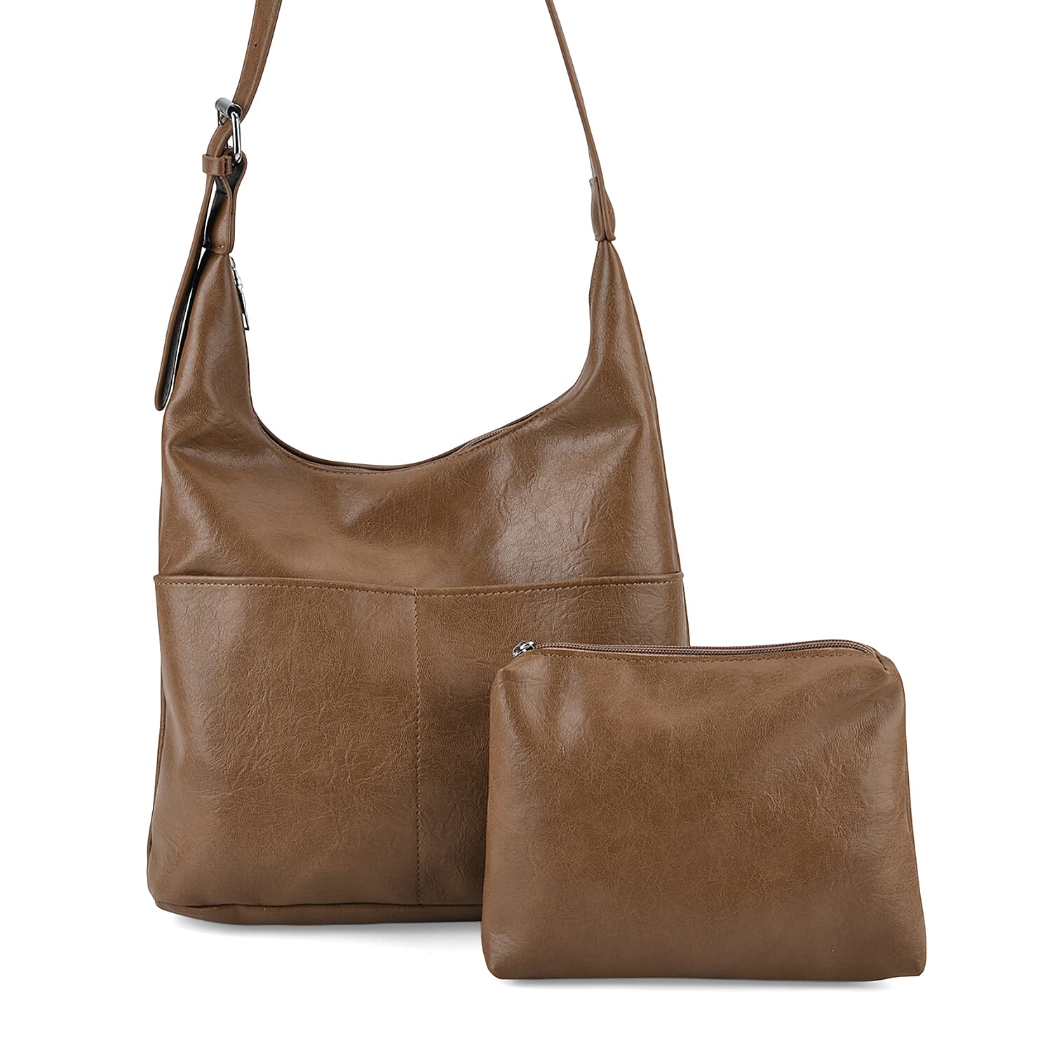 Hobo Multi-Pocket Shoulder Bag With Adjustable Crossbody Strap & Matching Pouch - Khaki