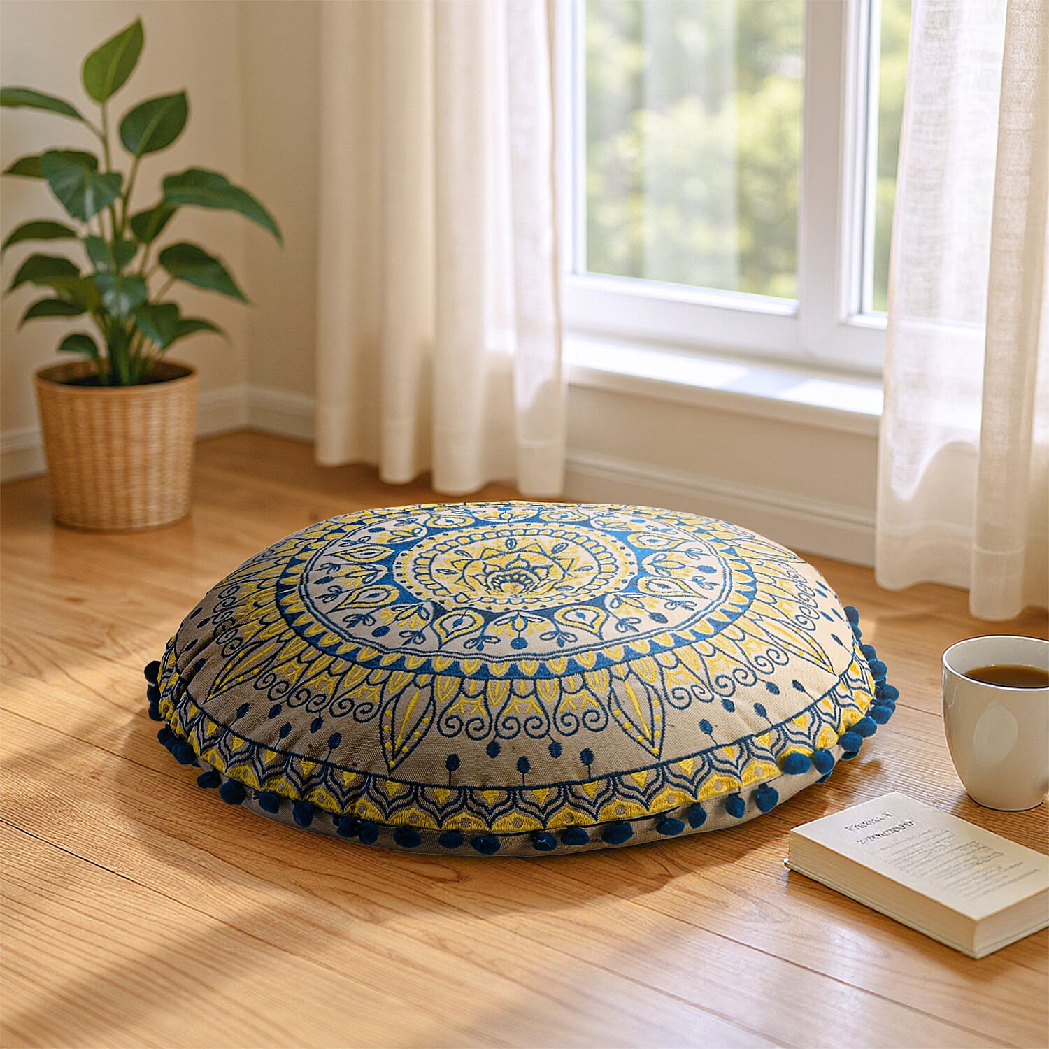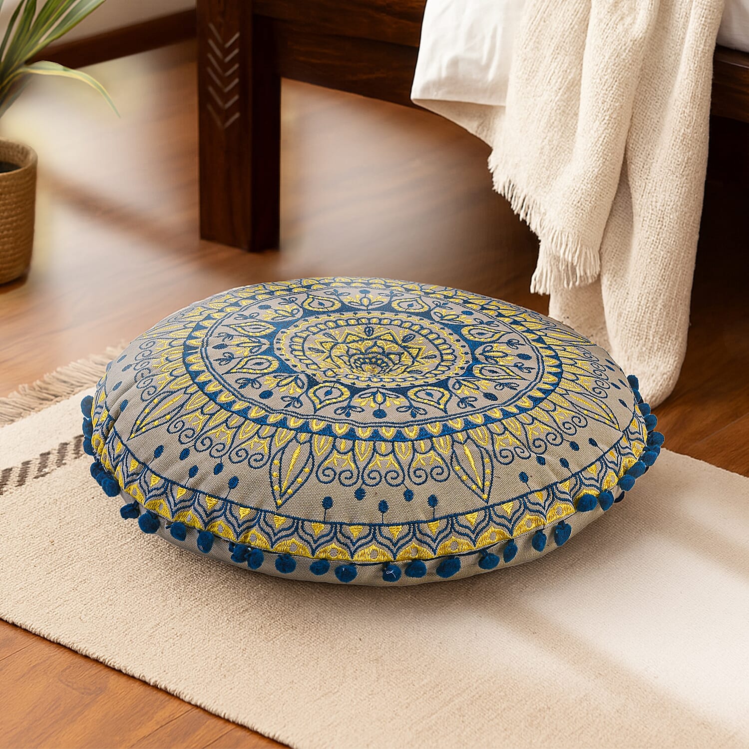 Cotton Cushion with Embroidery & Pom Pom (Size 40x10 cm) - Blue & Multi