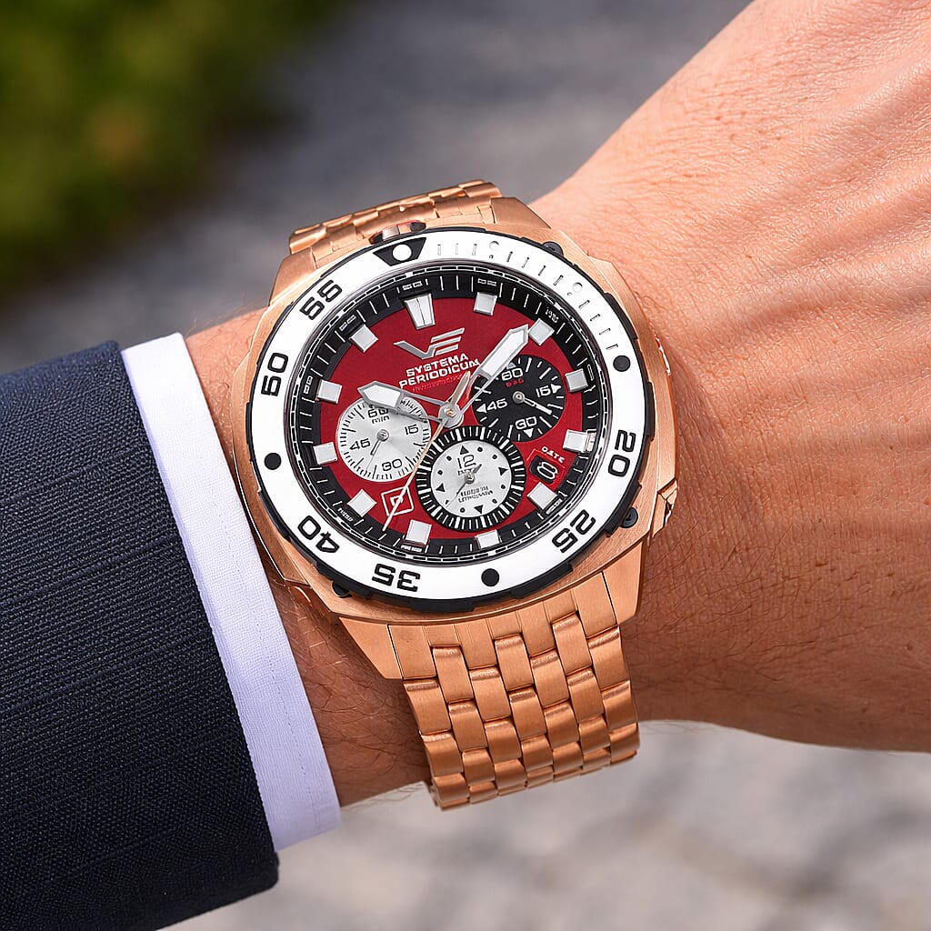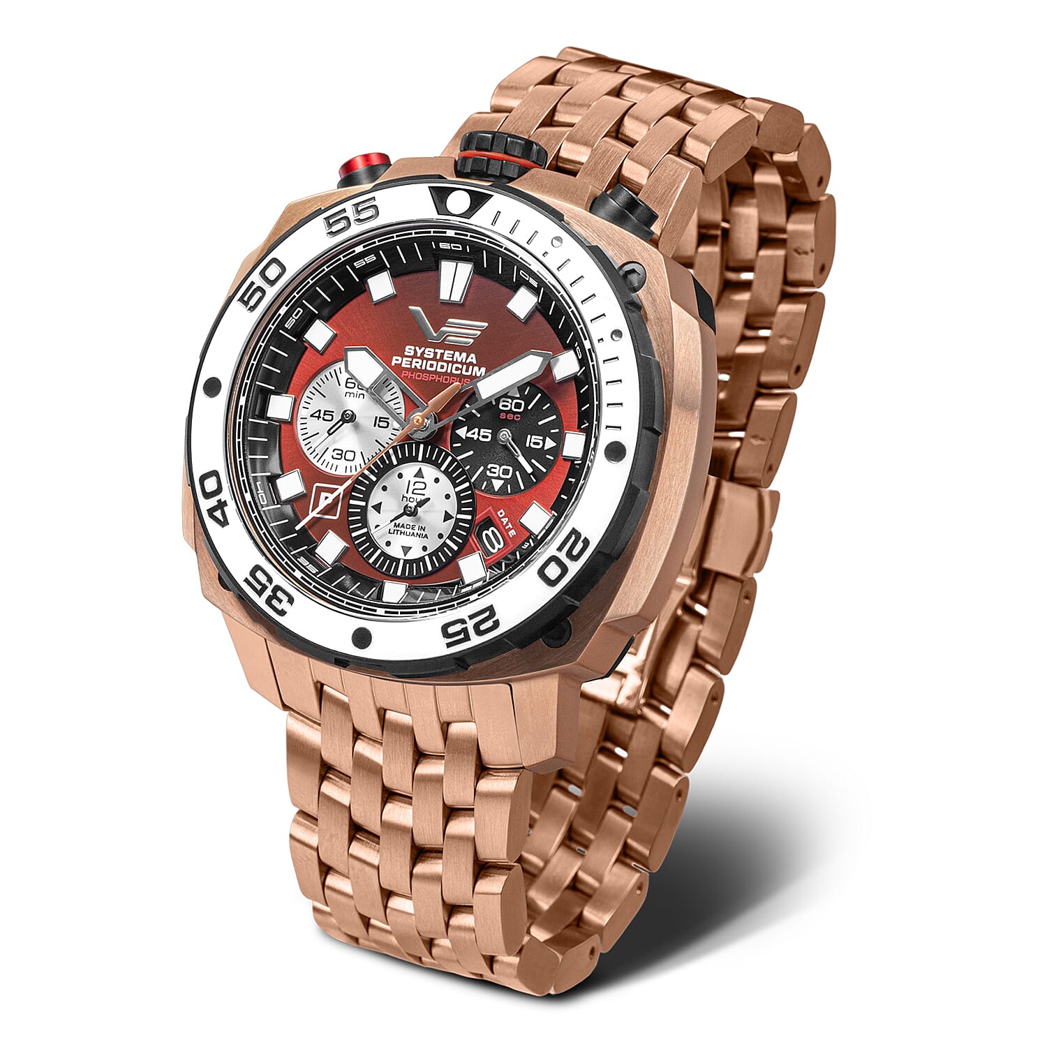 Vostok Europe Systema Periodicum Phosphorus TMI VK67 Mecha-Quartz Watch with a Red Dial and a Rose Stainless Steel Strap in a 46mm Rose Stainless Steel Case with 20 ATM VK67-650E724-B