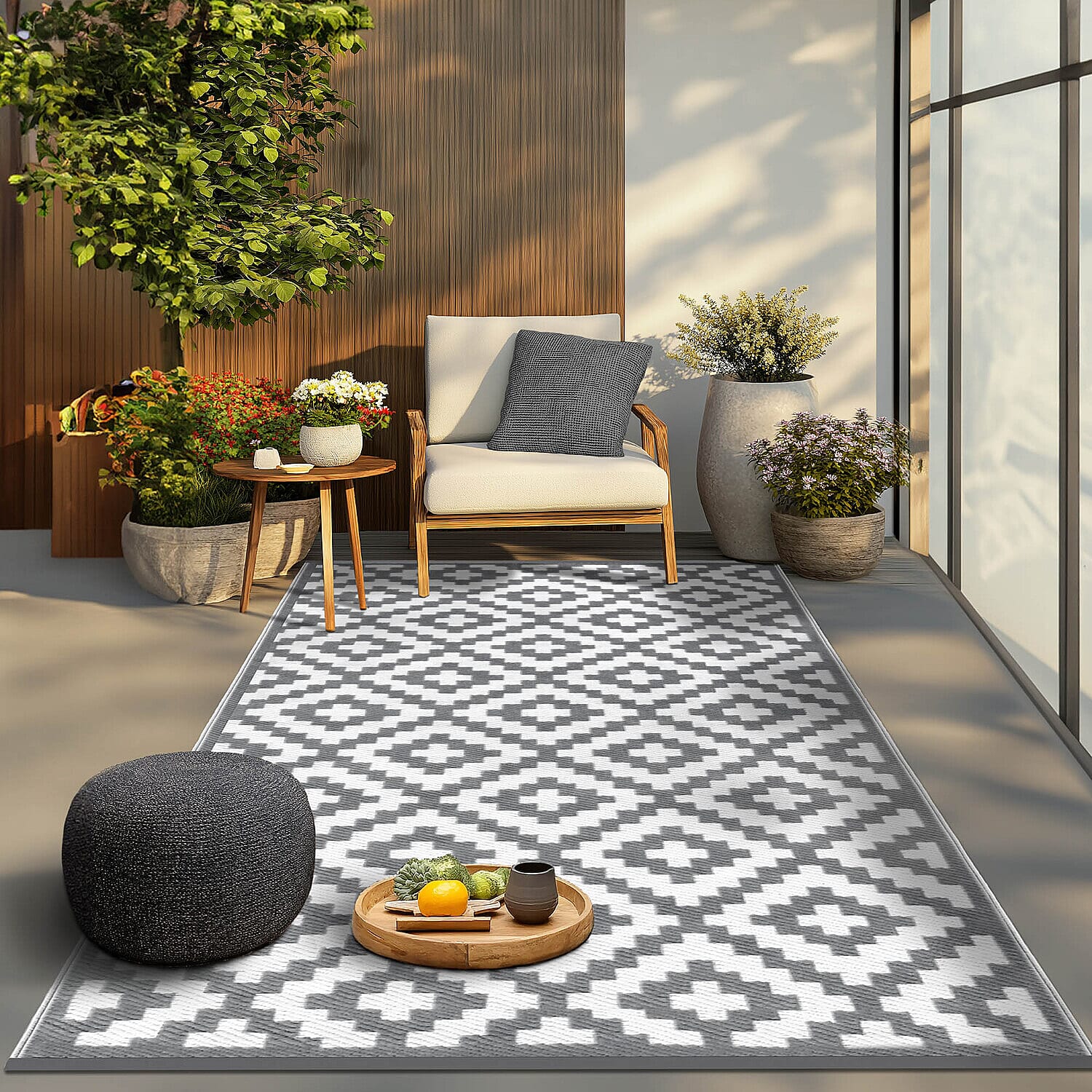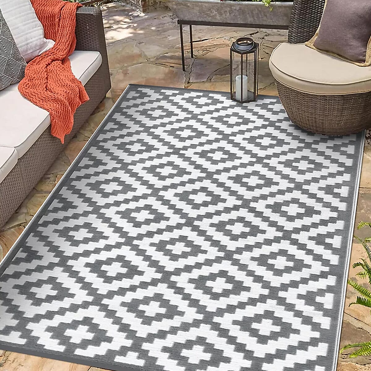 Green Decore Geometric Pattern Lightweight Reversible Stain Proof Outdoor Rug (150X90cm) - Grey & White
